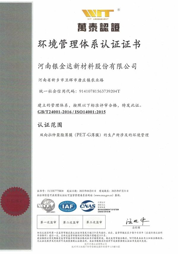 環(huán)境管理體系認(rèn)證證書