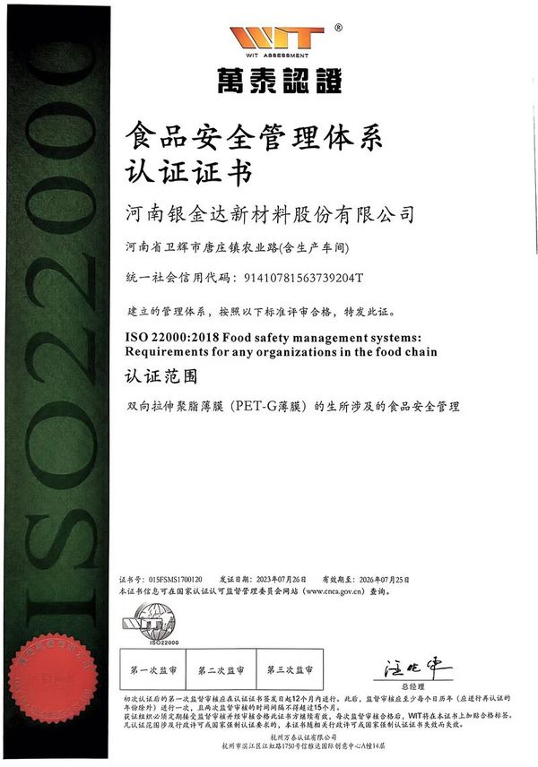 食品安全管理體系認(rèn)證證書